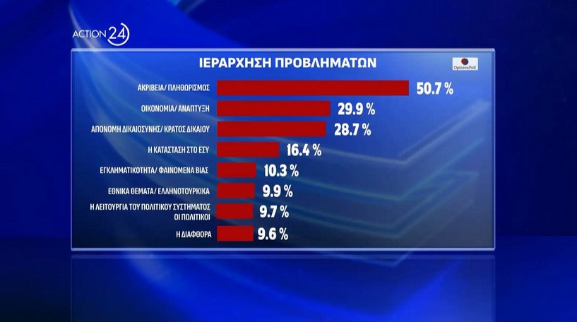 Στα προβλήματα που απασχολούν τους πολίτες η ακρίβεια αποτελεί το μεγαλύτερο με 50,7% και ακολουθεί η οικονομία με 29,9% και η απομονή δικαιοσύνης με 28,7%.