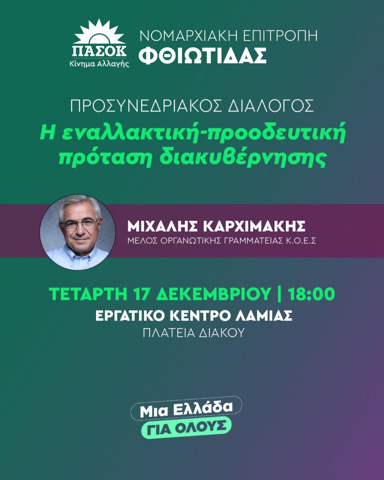 Η Νομαρχιακή Επιτροπή ΠΑΣΟΚ Φθιώτιδας διοργανώνει σήμερα Τετάρτη 17 Δεκεμβρίου στις 6.00μμ στο εργατικό κέντρο στην πλατεία Διάκου εκδήλωση με θέμα, «Η εναλλακτική και προοδευτική πρόταση διακυβέρνησης».