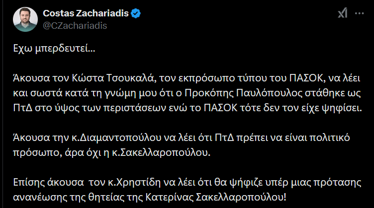 Άκουσα την κ. Διαμαντοπούλου να λέει ότι ΠτΔ πρέπει να είναι πολιτικό πρόσωπο, άρα όχι η κ.Σακελλαροπούλου. Επίσης, άκουσα τον κ. Χρηστίδη να λέει ότι θα ψήφιζε υπέρ μιας πρότασης ανανέωσης της θητείας της Κατερίνας Σακελλαροπούλου!».