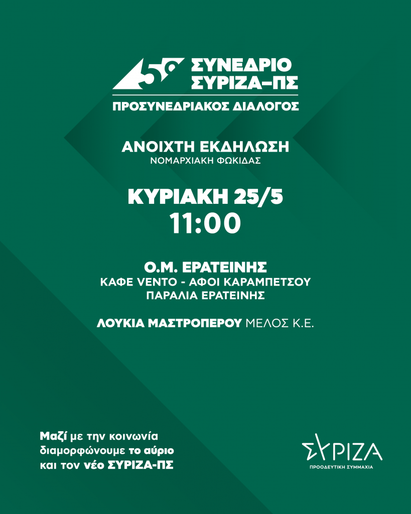 Η Νομαρχιακή Επιτροπή ΣΥΡΙΖΑ - ΠΣ Φωκίδας διοργανώνει πολιτική εκδήλωση στο πλαίσιο του προσυνεδριακού διαλόγου την Κυριακή 25/5 και ώρα 11.00 το πρωί στο καφέ VENTO (Αφοί Καραμπέτσου) στην Παραλία Ερατεινής.