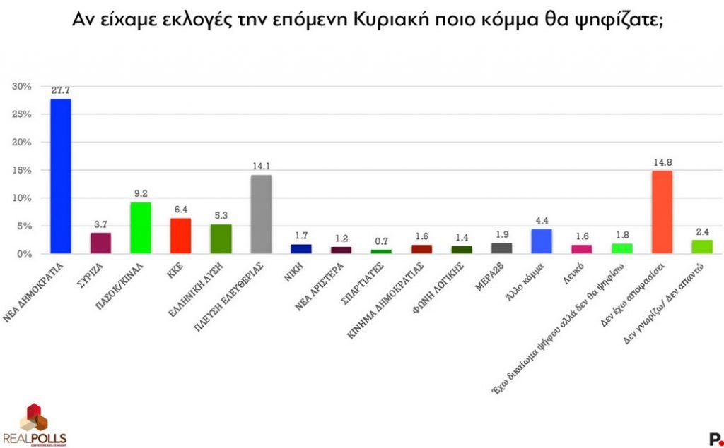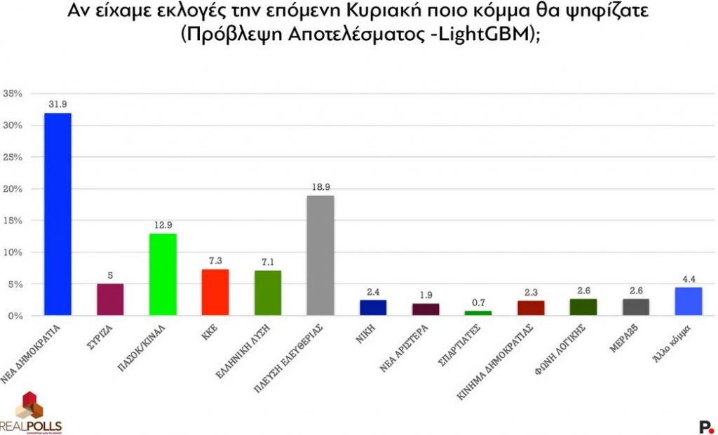 Real Polls: Αγγίζει το 32% η ΝΔ, παγιώνεται στη 2η θέση η Πλεύση, έξι κόμματα στην επόμενη Βουλή