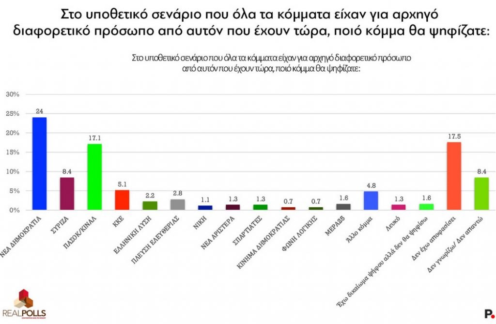 Στο ερώτημα για το ποιο κόμμα θα ψηφίζατε αν όλα είχαν διαφορετικό αρχηγό, το πιο προσωποκεντρικό αναδεικνύεται το κόμμα της Ζωής Κωνσταντοπούλου, ενώ εντυπωσιακή είναι και η προτίμηση των ψηφοφόρων σε άλλο πρόσωπο για την ηγεσία του ΠΑΣΟΚ. Αξίζει να σημειωθεί ότι σχεδόν ένας δύο (45,4%) θεωρεί ότι για το ΠΑΣΟΚ θα ήταν επιτυχία αν βγει δεύτερο στις επόμενες εκλογές.