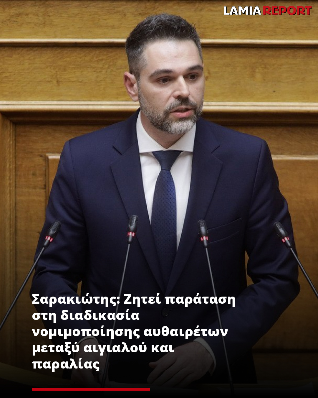 Τη χορήγηση παράτασης για τη διαδικασία νομιμοποίησης των αυθαιρέτων κατασκευών μεταξύ αιγιαλού και παραλίας στη Φθιώτιδα ζητά, μέσω ερώτησής του προς τον Υπουργό Εθνικής Οικονομίας και Οικονομικών, ο Βουλευτής Φθιώτιδας Γιάννης Σαρακιώτης.