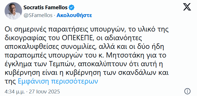 Παραίτηση της κυβέρνησης και εκλογές ζητά σε δήλωσή του ο Σωκράτης Φάμελλος μετά τις παραιτήσεις του υπουργού Μετανάστευσης και Ασύλου, Μάκη Βορίδη και των τριών υφυπουργών που φέρονται να εμπλέκονται στο σκάνδαλο του ΟΠΕΚΕΠΕ σύμφωνα με την δικογραφία που διαβιβάστηκε στην Βουλή.
