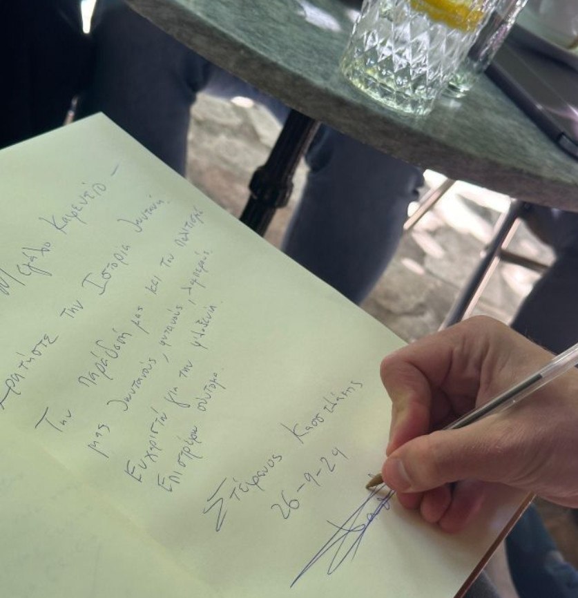 Μάλιστα στο βιβλίο αφιερώσεων του καφενείου έγραψε ένα μήνυμα με πολλαπλούς αποδέκτες.
