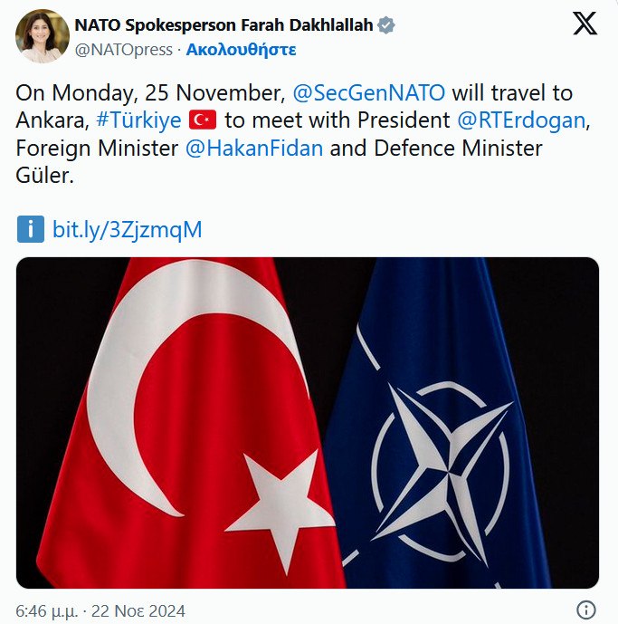 Ειδικότερα, η εκπρόσωπος Τύπου του ΝΑΤΟ, δήλωσε σήμερα (22.11.2024), ότι ο Γενικός Γραμματέας του NATO, Μαρκ Ρούτε, θα βρεθεί στην Αθήνα εν μέσω κρίσιμων γεωπολιτικών εξελίξεων, για επαφές τόσο με τον Πρωθυπουργό όσο και με τους Υπουργούς Εξωτερικών και Άμυνας.