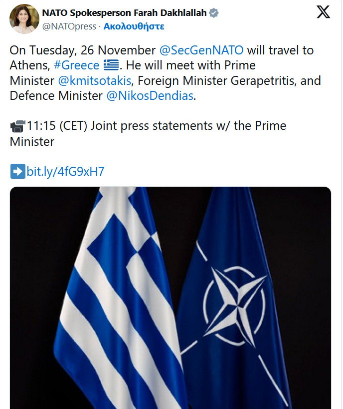 Σύμφωνα με την ανακοίνωση, ο επικεφαλής του NATO θα φτάσει στις 26 Νοεμβρίου 2024 στην Αθήνα, όπου θα συναντηθεί με τον πρωθυπουργό Κυριάκο Μητσοτάκη, με τον υπουργό Εξωτερικών Γιώργο Γεραπετρίτη και με τον υπουργό Εθνικής Άμυνας Νίκο Δένδια.