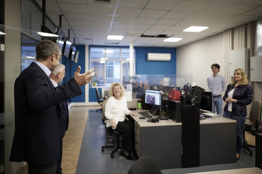 Τον πρωθυπουργό υποδέχθηκε ο πρόεδρος της Δημόσιας Τηλεόρασης, Γιάννης Παπαδόπουλος, ο οποίος τον ξενάγησε στους χώρους και τον ενημέρωσε, μεταξύ άλλων, για τις νέες ψηφιακές δυνατότητες της ERTNews και του Ertflix, χάρη στις οποίες άτομα με προβλήματα όρασης και ακοής μπορούν να αποκτήσουν όσο το δυνατόν πιο άρτια πρόσβαση, κυρίως στο ειδησεογραφικό περιεχόμενο.