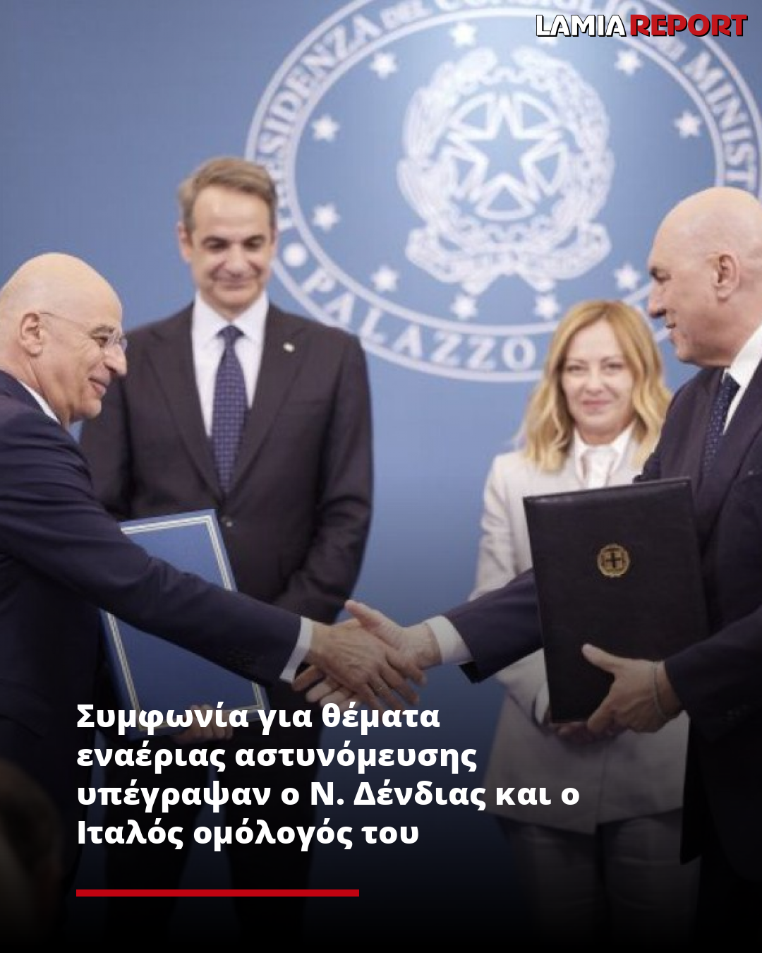 Ο υπουργός Εθνικής Άμυνας Νίκος Δένδιας και ο Ιταλός ομόλογός του Γκουίντο Κροσέτο υπέγραψαν σήμερα στη Ρώμη συμφωνία για Θέματα Εναέριας Αστυνόμευσης (Air Policing), σχετικά με την αντιμετώπιση εναέριων μη στρατιωτικών απειλών.
