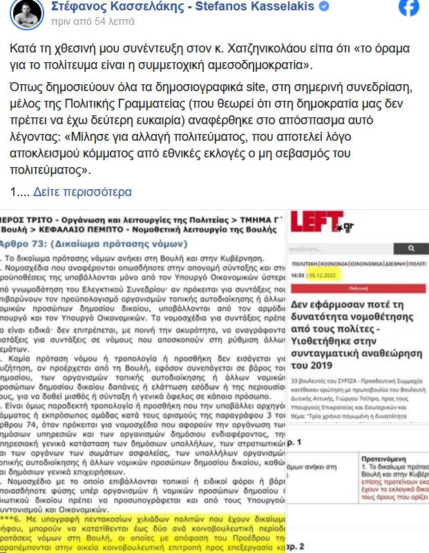 Στην ανάρτησή του, ο Στέφανος Κασσελάκης αναφέρεται και στη φράση που είπε στη χθεσινή (10/10/24) συνέντευξή του στον ΑΝΤ1 ότι «το όραμα για το πολίτευμα είναι η συμμετοχική αμεσοδημοκρατία».