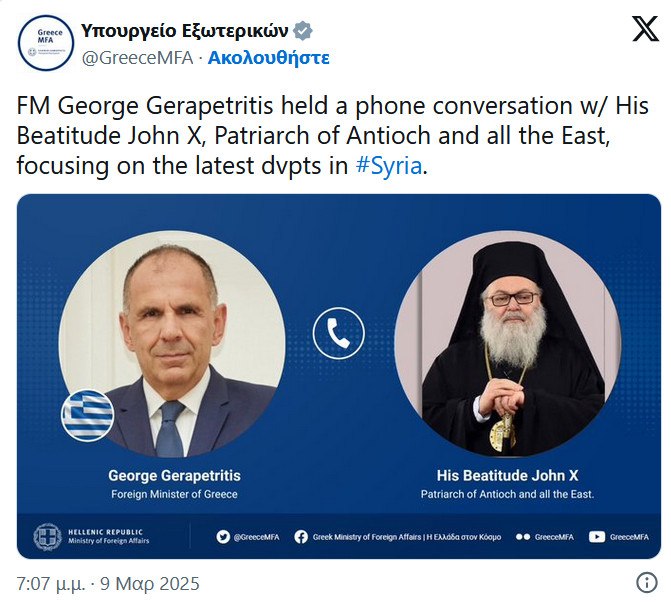 Ο υπουργός Εξωτερικών Γιώργος Γεραπετρίτης είχε την Κυριακή τηλεφωνική συνομιλία με τον Πατριάρχη Αντιποχείας Ιωάννη Ι΄ με επίκεντρο το κύμα βίας και σφαγών στη Συρία που έχει προκαλέσει πάνω από 1.000 νεκρούς μέσα σε λίγες ημέρες.