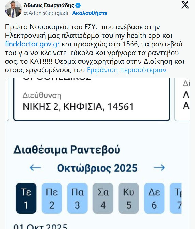 «Πρώτο νοσοκομείο του ΕΣΥ που ανέβασε στην ηλεκτρονική μας πλατφόρμα τα ραντεβού του για να κλείνετε εύκολα και γρήγορα τα ραντεβού σας, το ΚΑΤ! Θερμά συγχαρητήρια στη διοίκηση και στους εργαζομένους του για την πρωτιά τους!», ανέφερε χαρακτηριστικά ο Άδωνις Γεωργιάδης σε ανάρτησή του στην πλατφόρμα X (πρώην Twitter).