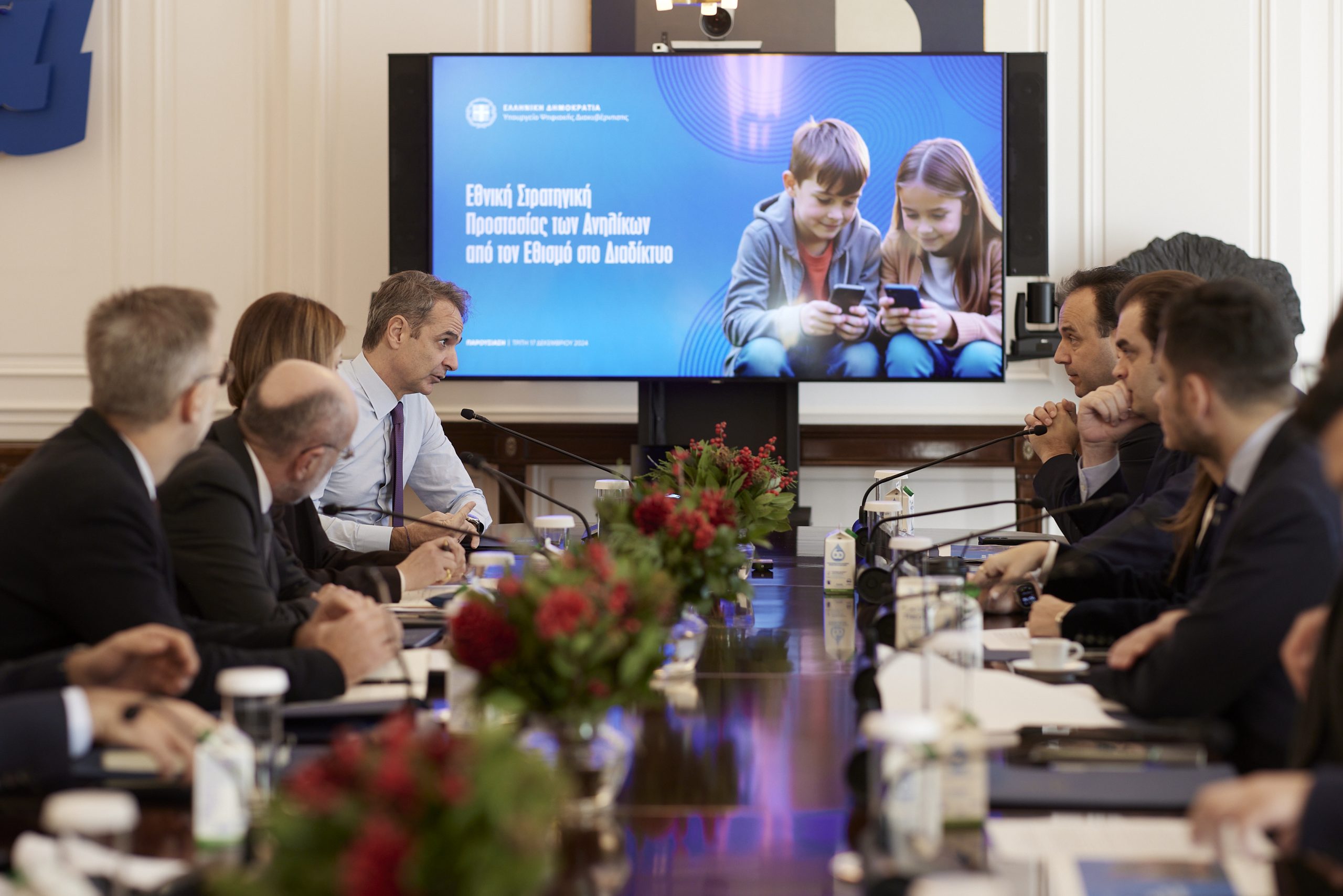 Ολοκληρώθηκε η σύσκεψη υπό τον πρωθυπουργό Κυριάκο Μητσοτάκη στο Μέγαρο Μαξίμου με θέμα την προστασία των ανηλίκων από τους κινδύνους του διαδικτύου και τον εθισμό στα μέσα κοινωνικής δικτύωσης.