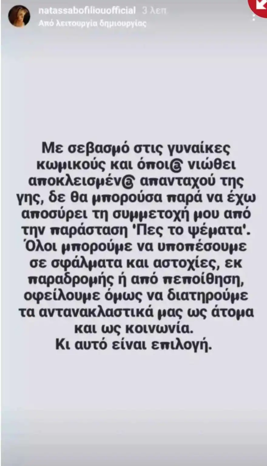 Στο ίδιο πνεύμα και η Νατάσσα Μποφίλιου, η οποία στη δική της ανάρτηση στο Instagram εκφράζει τον «σεβασμό στις γυναίκες κωμικούς και οποι@ νιώθει αποκλεισμέν@ απανταχού της γης» και εξηγεί ότι «δεν θα μπορούσα παρά να έχω αποσύρει τη συμμετοχή μου από την παράσταση».