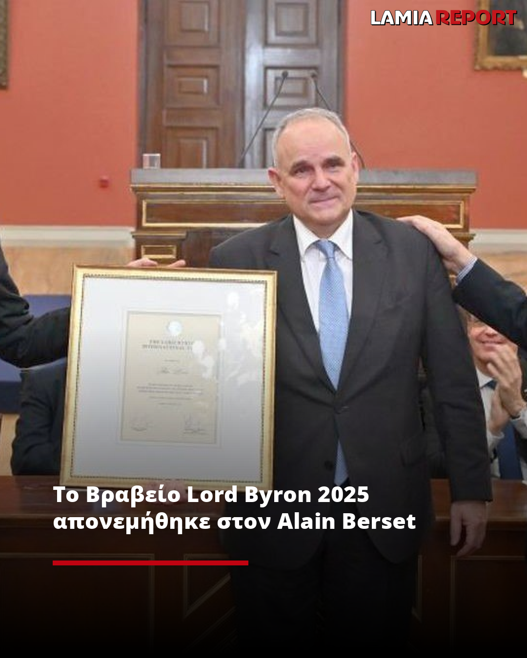 Ο κ. Alain Berset, Γενικός Γραμματέας του 46μελούς Συμβουλίου της Ευρώπης, κατά την πρώτη επίσημη επίσκεψή του στην Ελλάδα βραβεύτηκε με το διεθνές Βραβείο Φιλελληνισμού Lord Byron Prize 2025 πραγματοποιώντας την έναρξη της ομιλίας του στην ελληνική γλώσσα, θέλοντας να υπογραμμίσει τη σημασία της για τον παγκόσμιο πολιτισμό.