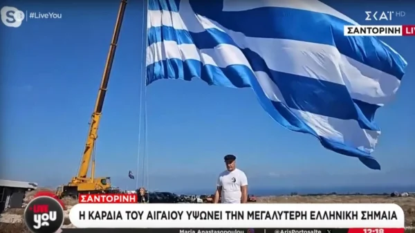 Πρόκειται για μια γαλανόλευκη σημαία τεράστιων διαστάσεων που φτάνουν τα 32Χ45 τετραγωνικά μέτρα.