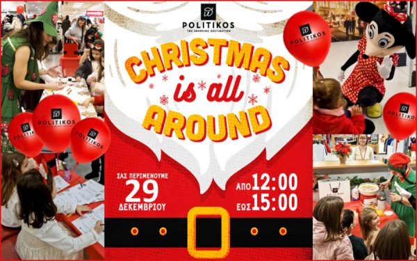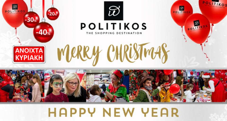 Η Διοίκηση και οι Εργαζόμενοι του Πολυκαταστήματος “POLITIKOS”, σας προσκαλούν αυτό το Σάββατο 21 Δεκεμβρίου, σε μια λαμπερή εκδήλωση για μικρούς και μεγάλους με Κεράσματα, Face Painting, Χριστουγεννιάτικες Κατασκευές, Μπαλόνια, πολλές Εκπλήξεις και Μεγάλες Προσφορές!