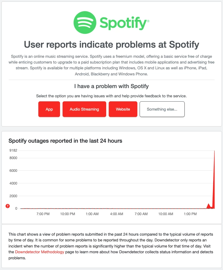 Σύμφωνα με τον ιστότοπο DownDetector, περισσότεροι από 17.000 χρήστες έχουν αναφέρει προβλήματα, με το 69% να αφορά την εφαρμογή, το 30% την ιστοσελίδα και μόλις 1% την ίδια τη ροή ήχου.