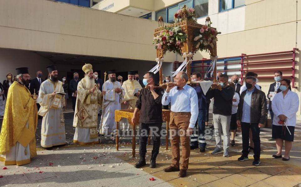 Κάτω από το εκκλησάκι του Αγίου Νεκταρίου, που έχει μπει σε διαδικασία πλήρους συντήρησης - ανακατασκευής, πραγματοποιήθηκε εντός του προαύλιου χώρου του Γενικού Νοσοκομείου Λαμίας, η περιφορά του Επιταφίου, που παραδοσιακά είναι ο πρώτος που βγαίνει στην πόλη.