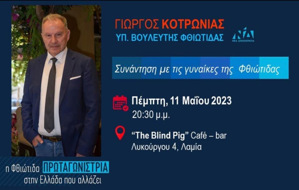 Σήμερα Πέμπτη (11/5) στις 8:30' το βράδυ ο Γιώργος Κοτρωνιάς θα πραγματοποιήσει εκδήλωση για τις γυναίκες στο "The blind pig", Λυκούργου 4, στη Λαμία.