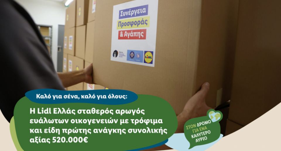 Με βαθιά συναίσθηση της ευθύνης της απέναντι στο κοινωνικό σύνολο και αντλώντας έμπνευση από τις διαχρονικές εταιρικές της αξίες, η Lidl Ελλάς διευρύνει τη συνεργασία της με το Δίκτυο Κοινωνικής Αλληλεγγύης & Αρωγής (Δίκτυο) και το Κέντρο Υποδοχής & Αλληλεγγύης Δήμου Αθηναίων (Κ.Υ.Α.Δ.Α.) για 5η συνεχή χρονιά, συνεχίζοντας την πρωτοβουλία «Συνέργεια Προσφοράς και Αγάπης». Με το πέρας της φετινής συνεργασίας, η Lidl Ελλάς θα έχει προσφέρει συνολικά προϊόντα αξίας 520.000€ για τη στήριξη οικογενειών που έχουν πραγματικά ανάγκη.