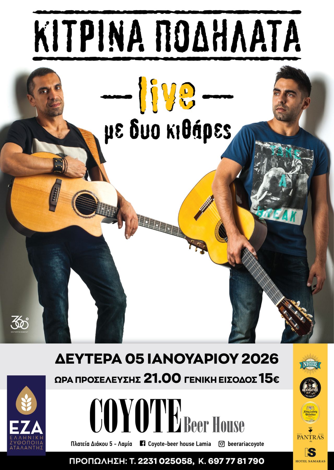 📅 Δευτέρα 05 Ιανουαρίου 2026 ➜ Τα πάντα αγαπημένα Κιτρίνα Ποδήλατα, live με δύο κιθάρες και διαχρονικά ελληνικά τραγούδια, είναι βέβαιο πως θα μας ξεσηκώσουν με την απίστευτη ενέργειά τους.