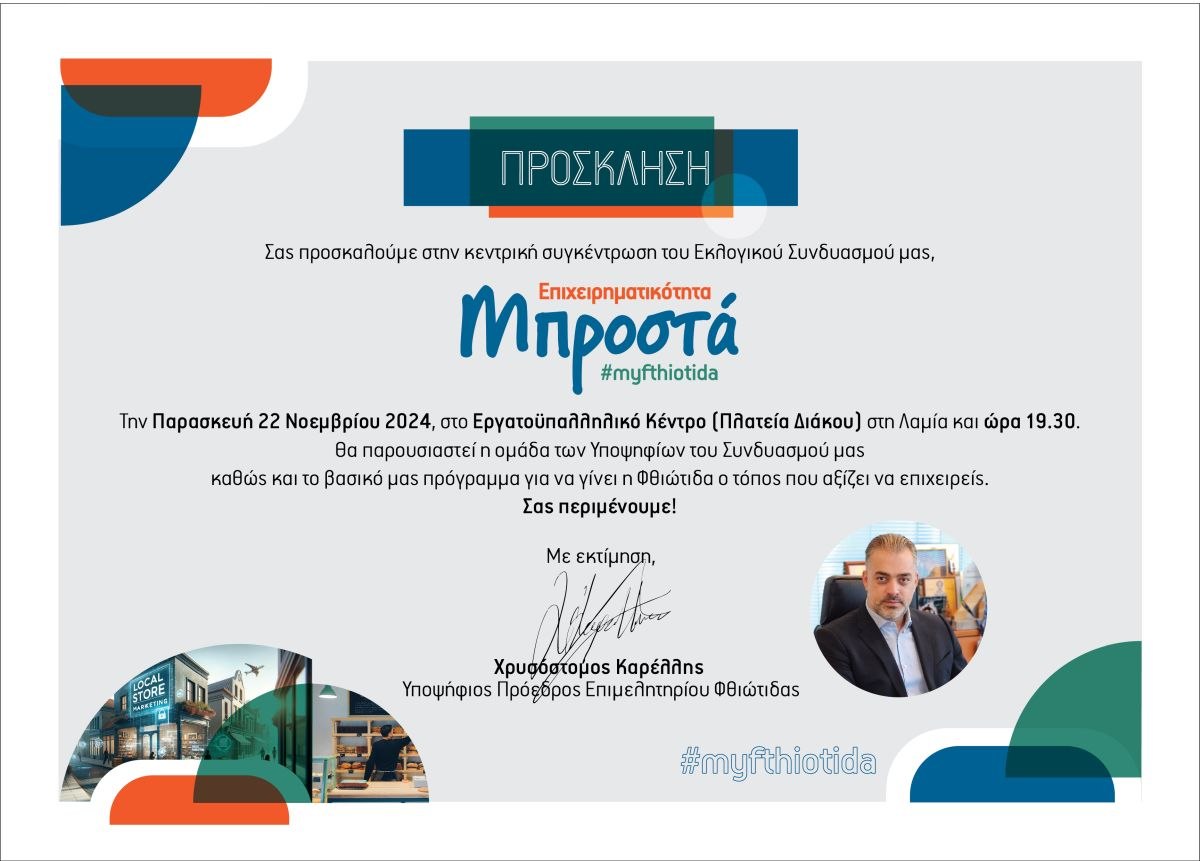 O Εκλογικός Συνδυασμός "Επιχειρηματικότητα Μπροστά" και η ομάδα των Υποψηφίων, σας προσκαλούν στην κεντρική συγκέντρωσή, στο Εργατοϋπαλληλικό Κέντρο Λαμίας, στην πλατεία Διάκου, την Παρασκευή 22 Νοεμβρίου, στις 19:30.