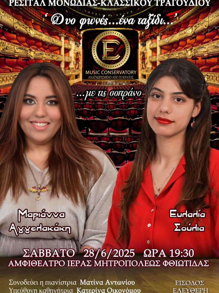 Το Σάββατο 28 Ιουνίου 2025, στις 7:30' το απόγευμα, στο αμφιθέατρο της Μητρόπολης, θα φιλοξενηθούν δύο σοπράνο του τμήματος Μονωδίας - Κλασικού τραγουδιού, που διακρίνονται για το φωνητικό τους ταλέντο, την εργατικότητά τους και την καλλιτεχνική τους αφοσίωση.