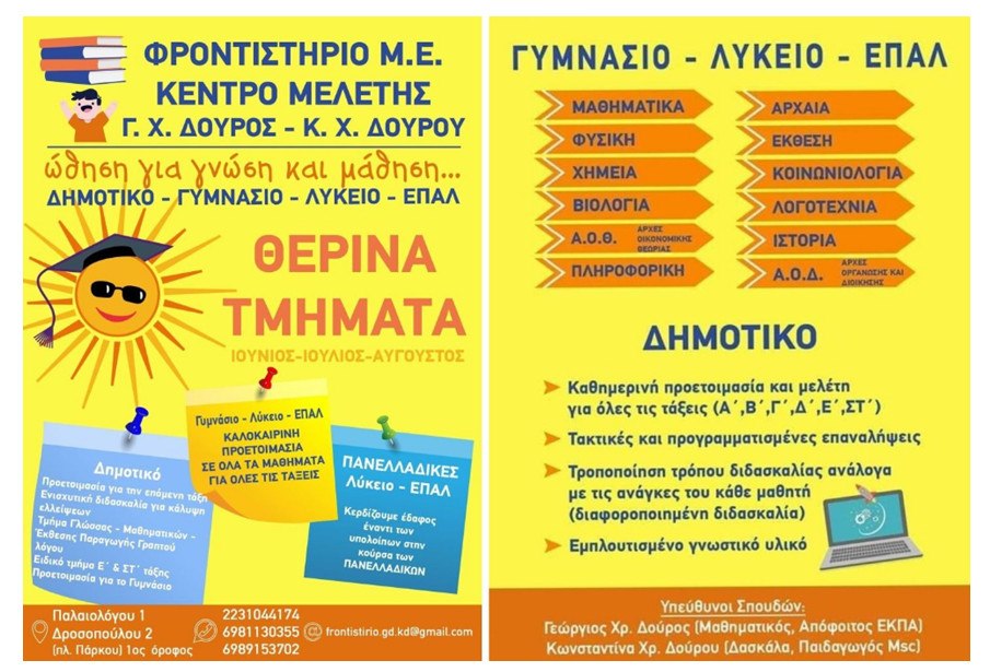 Τα θερινά μαθήματα στo «ΦΡΟΝΤΙΣΤΗΡΙO Μ.Ε / ΚΕΝΤΡO ΜΕΛΕΤΗΣ Γ. Χ. ΔΟΥΡΟΣ - Κ. Χ. ΔΟΥΡΟΥ» ξεκινούν!