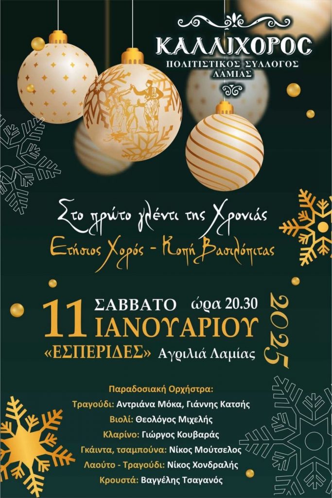 Ο Πολιτιστικός Σύλλογος Λαμίας "Καλλίχορος" διοργανώνει τον ετήσιο χορό του, σε συνδυασμό με την κοπή Βασιλόπιτας για τη νέα χρονιά.