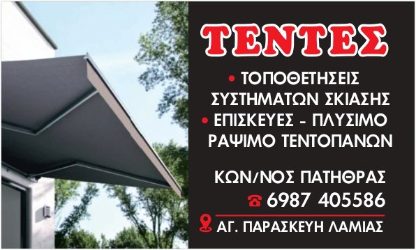 - Τέντες παντός τύπου (πτυσσόμενες, κάθετες, κασετίνες, με σπαστούς βραχίονες, με ζελατίνες)