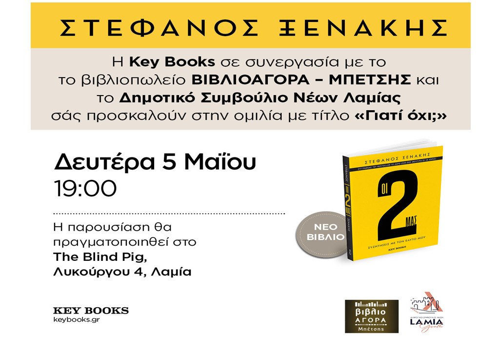Η Βιβλιοαγορά Μπέτσης και το Δημοτικό Συμβούλιο Νέων Λαμίας σας προσκαλούν στην ομιλία του Στέφανου Ξενάκη με τίτλο «Οι 2 ΜΑΣ».