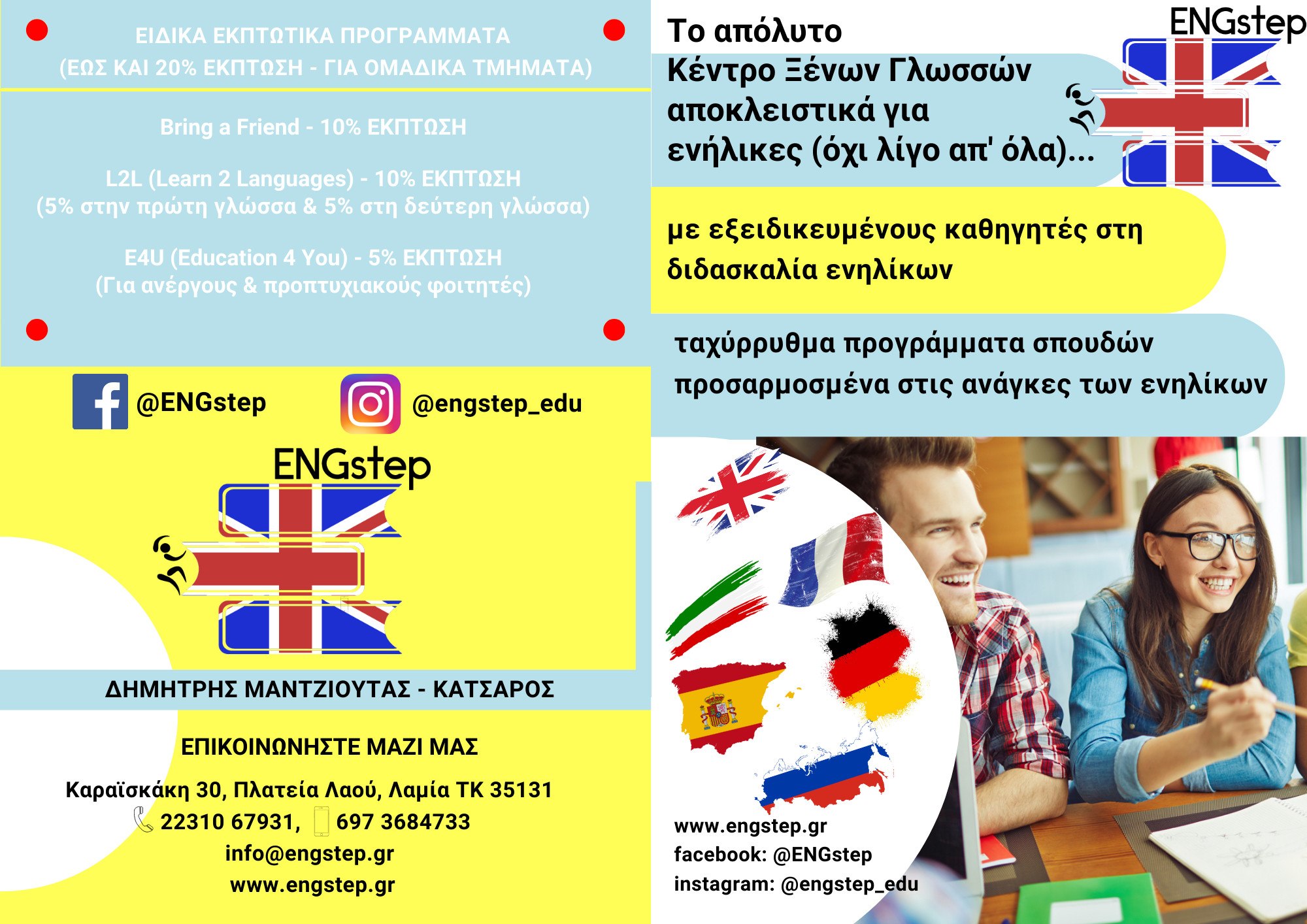 Έλα τώρα στο «ENGstep», Καραϊσκάκη 30 στην Πλ. Λαού, και επίλεξε να μάθεις Αγγλικά, Γαλλικά, Γερμανικά, Ισπανικά, Ιταλικά και Ρωσικά - άμεσα, εύκολα και αξιόπιστα.
