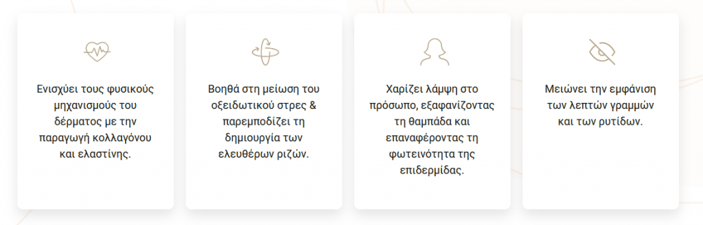 Μέσω της θεραπείας επιτυγχάνεται κατακόρυφη αύξηση παραγωγής κολλαγόνου και ελαστίνης, βελτίωση της υφής της επιδερμίδας, αναβάθμιση της ποιότητας του δέρματος και ενίσχυση των αμυντικών μηχανισμών του έναντι εξωτερικών βλαπτικών παραγόντων. Ταυτόχρονα, η θεραπεία καταπραΰνει φλεγμονές και ερυθρότητα, χαρίζοντάς σου ένα καθαρό και φωτεινό πρόσωπο.