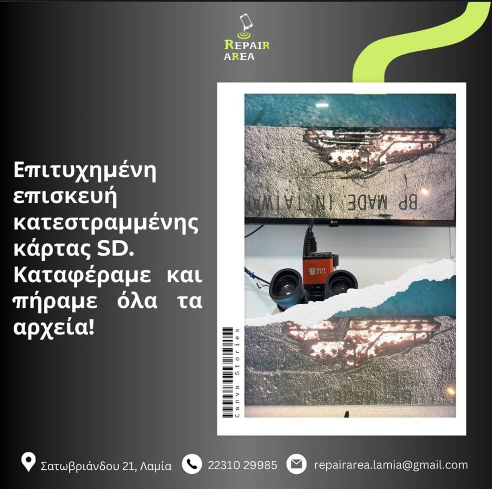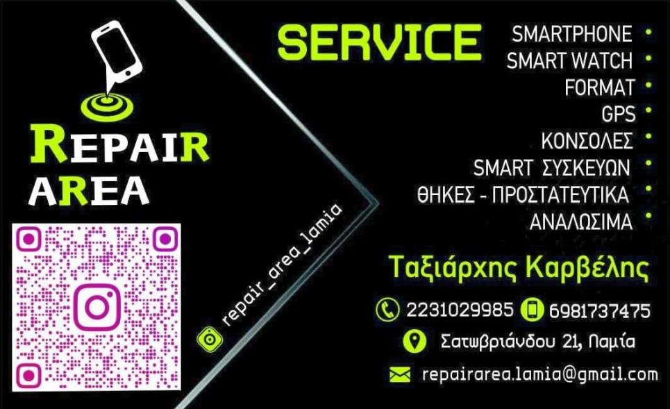 Το Repair Area βρίσκεται στην οδό Σατωβριάνδου 21, κοντά στο κέντρο της Λαμίας και προσφέρει "έξυπνες λύσεις" σε όλες τις κινητές συσκευές που χρειάζεσαι στην καθημερινότητά σου, καθιστώντας τες πλήρως λειτουργικές.