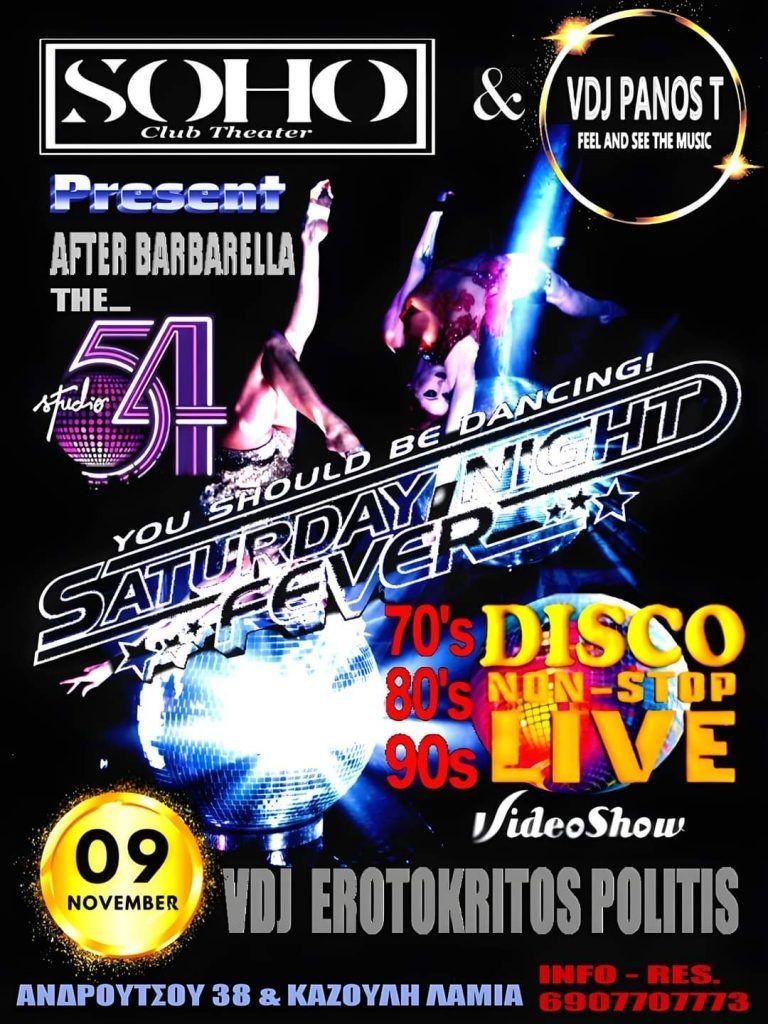 Μετά την επιτυχημένη disco βραδιά "Barbarella", το "Soho Club Theater" σε συνεργασία με τον VDJ Panos T, διοργανώνουν μια βραδιά ανάλογης λαμπρότητας με πολλή διασκέδαση, χορό και κέφι ως το πρωί.