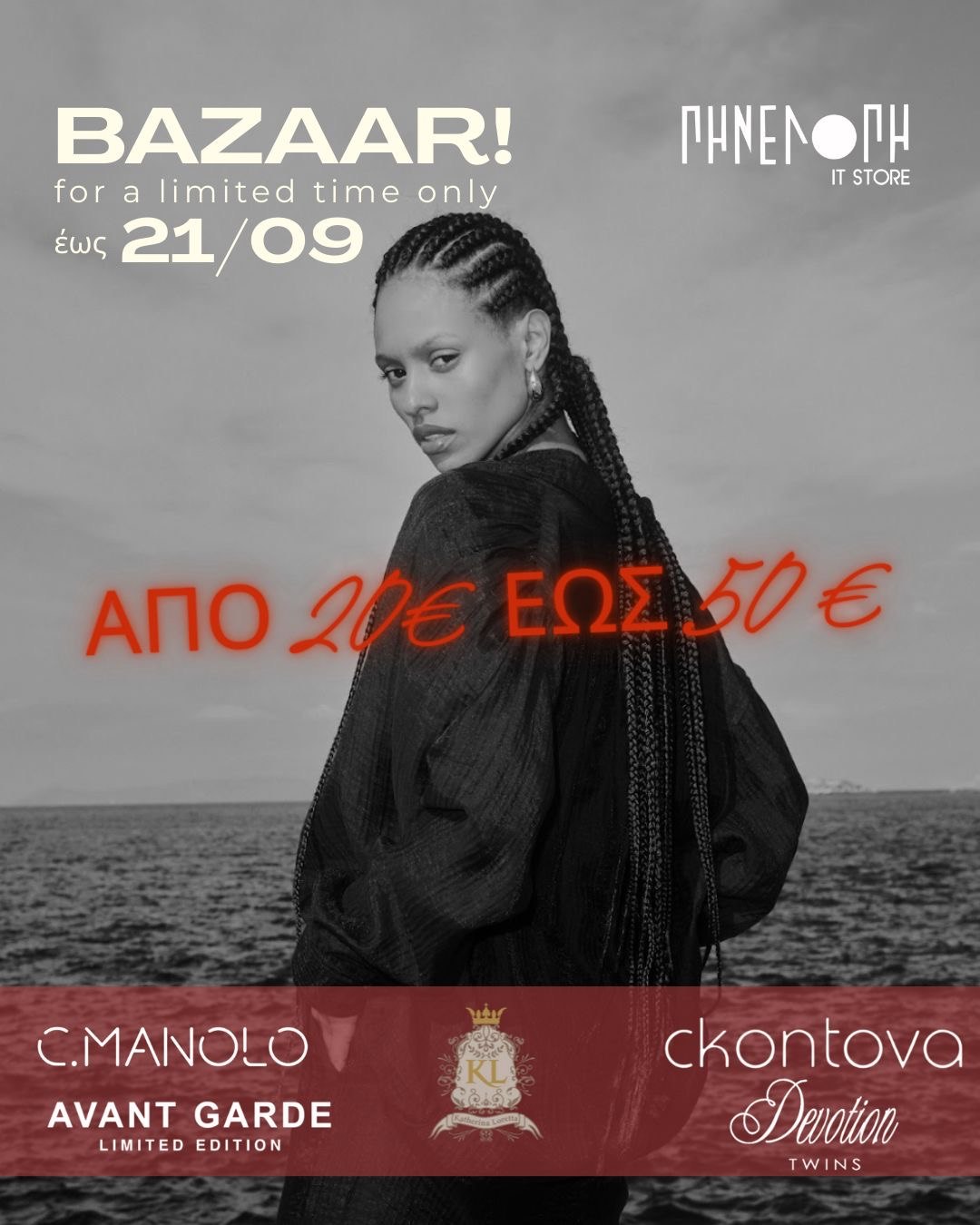 Και τώρα, η boutique σας προσκαλεί σε ένα μεγάλο BAZAAR τέλους καλοκαιρινής σεζόν, με επιλεγμένα καλοκαιρινά ρούχα και αξεσουάρ σε τιμές-σοκ από 20€ έως 50€!
