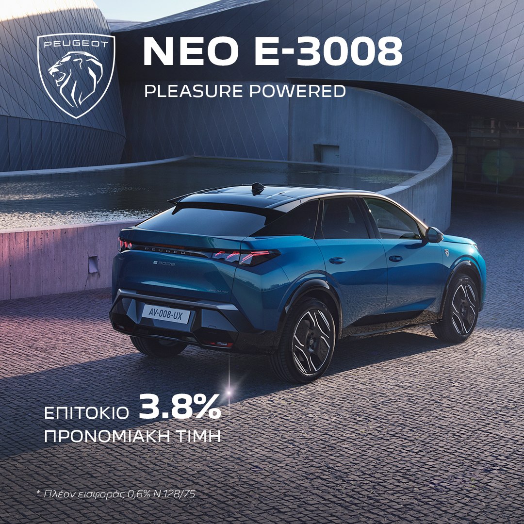 Το Νέο E-3008 210hp (Standard Range με 527km ηλεκτρ. αυτονομία σε μικτό κύκλο) διατίθεται από 45.900€