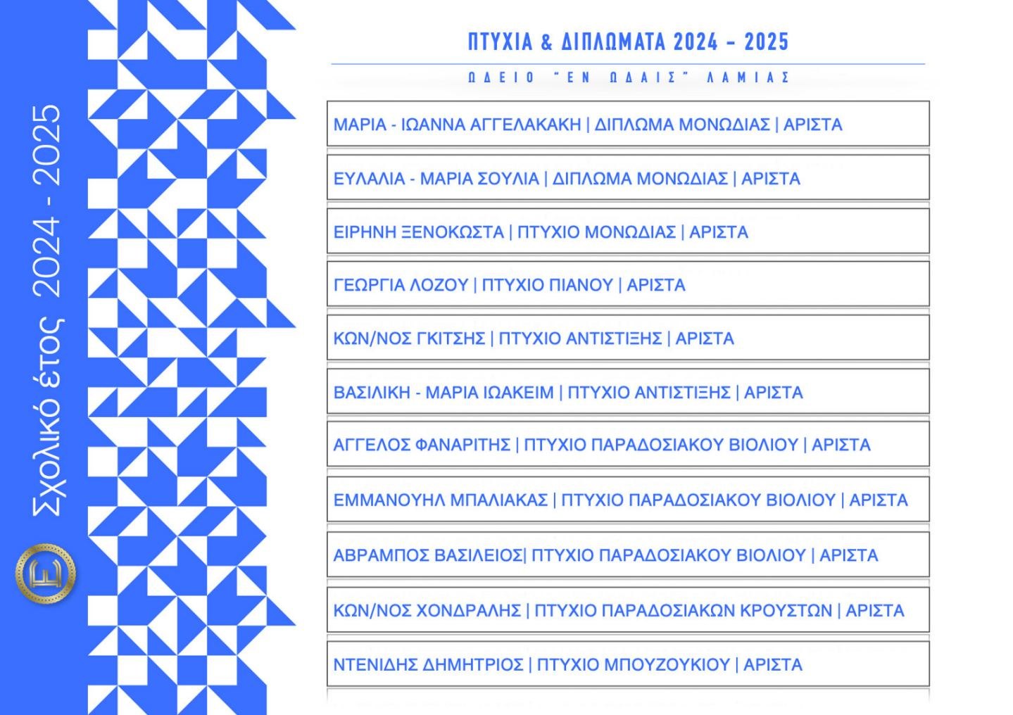 Δείτε παρακάτω επίσης τους μαθητές που αποφοίτησαν φέτος το καλοκαίρι από το Ωδείο "Εν Ωδαίς" παίρνοντας πτυχία και διπλώματα όλοι τους με Άριστα!!!