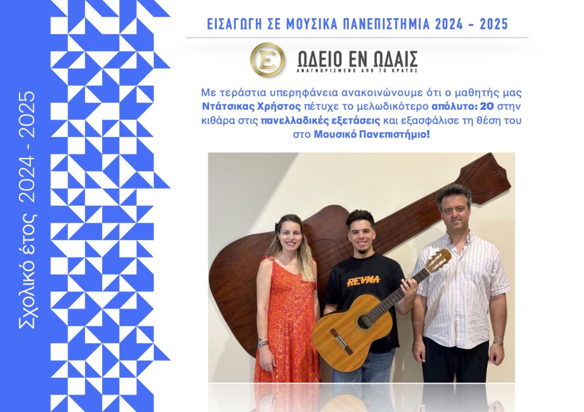 Με τεράστια υπερηφάνεια ανακοινώνουμε ότι ο μαθητής μας Χρήστος Ντάτσικας πέτυχε το μελωδικότερο απόλυτο: 20 στην κλασική κιθάρα στις πανελλαδικές εξετάσεις και εξασφάλισε τη θέση του στο Αριστοτέλειο Πανεπιστήμιο Θεσσαλονίκης, στη σχολή Καλών Τεχνών, στο τμήμα Μουσικών Σπουδών!