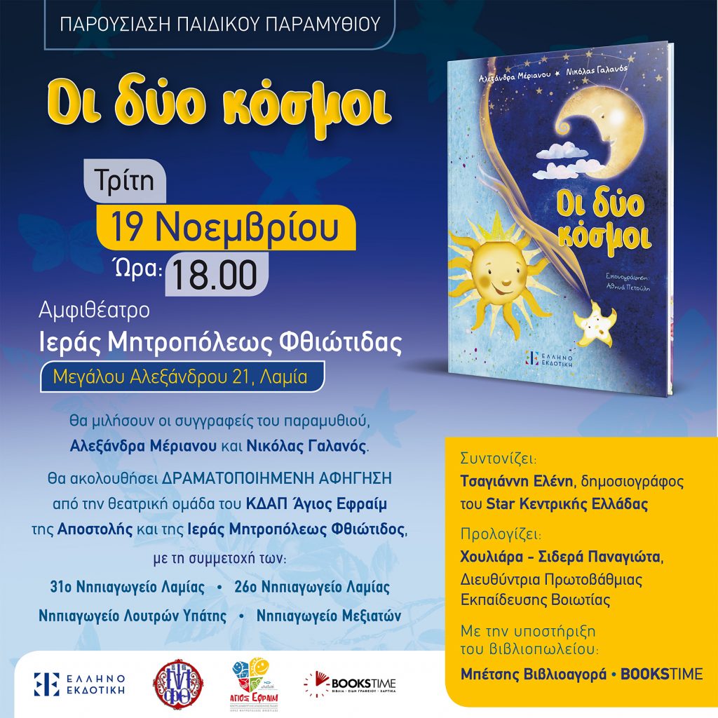 Τη βιβλιοπαρουσίαση θα συντονίσει η Ελένη Τσαγιάννη, δημοσιογράφος Star Κεντρικής Ελλάδας.