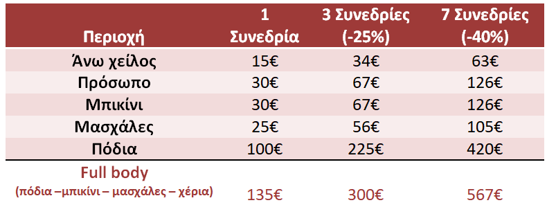 Είτε πρόκειται για μικρές περιοχές (άνω χείλος, μασχάλες, μπικίνι) είτε για μεγαλύτερες (πόδια, πλάτη), οι προσφορές σας δίνουν τη δυνατότητα για ολοκληρωμένη φροντίδα με προνομιακές τιμές.