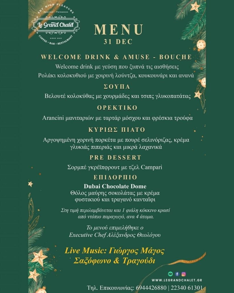 Την Τρίτη 31 Δεκεμβρίου 2024 το «Le Grand Chalet» ετοιμάζει για εσάς το πιο εορταστικό ρεβεγιόν Πρωτοχρονιάς που έχετε ποτέ βιώσει.
