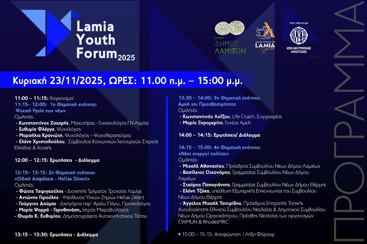 Το Συμβούλιο Νέων του Δήμου Λαμιέων διοργανώνει το διήμερο 22 Νοεμβρίου (16:00 μ.μ. - 21:00 μ.μ) & 23 Νοεμβρίου (11:00 π.μ. - 15:00 μ.μ.), στο αμφιθέατρο της Ιεράς Μητροπόλεως Φθιώτιδας, το «Lamia Youth Forum 2025».