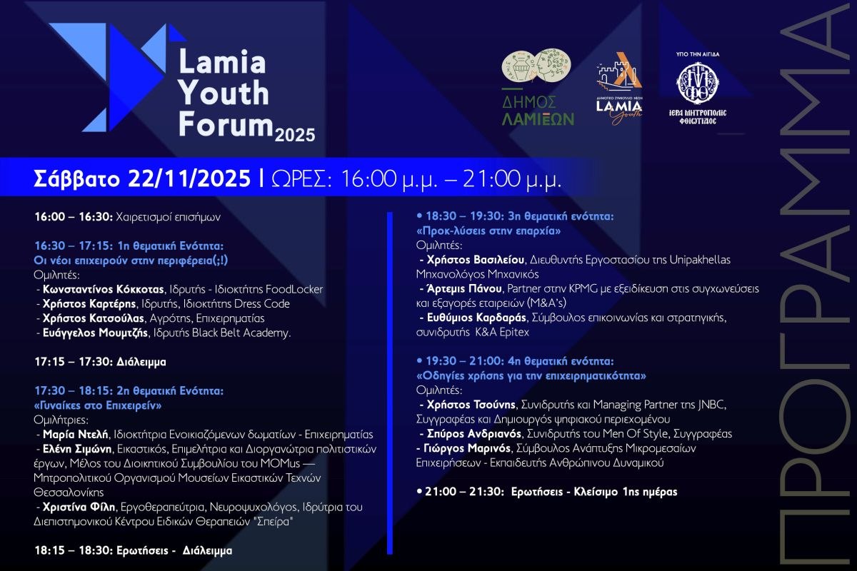 Την πρώτη ημέρα του «Lamia Youth Forum 2025» οι θεματικές ενότητες είναι αφιερωμένες στην «Νεανική Επιχειρηματικότητα στην Περιφέρεια της χώρας», ενώ στη διάρκεια της δεύτερης ημέρας θα μας απασχολήσουν «Σύγχρονα Κοινωνικά Ζητήματα των Νέων» (επισυνάπτεται το αναλυτικό πρόγραμμα των 2 ημερών).
