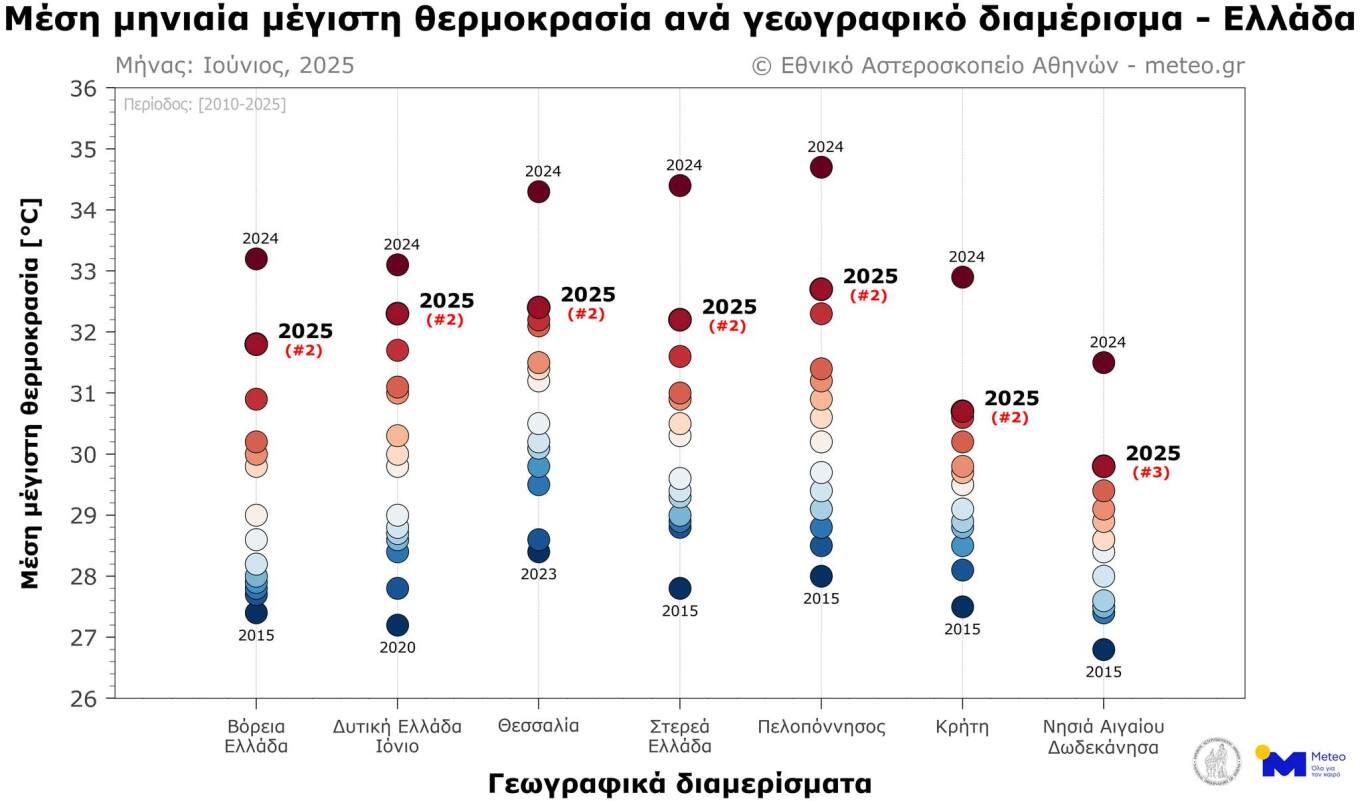 Ο Ιούνιος του 2025 ήταν ο δεύτερος θερμότερος από το 2010, όπως ανακοίνωσε το Εθνικό Αστεροσκοπείο Αθηνών, με τη μέση τιμή των μεγίστων ημερήσιων θερμοκρασιών να κυμαίνεται πάνω από τα κανονικά για την εποχή επίπεδα σε όλες τις περιοχές της χώρας (σε σχέση με τον μέσο όρο της περιόδου 2010-2019).