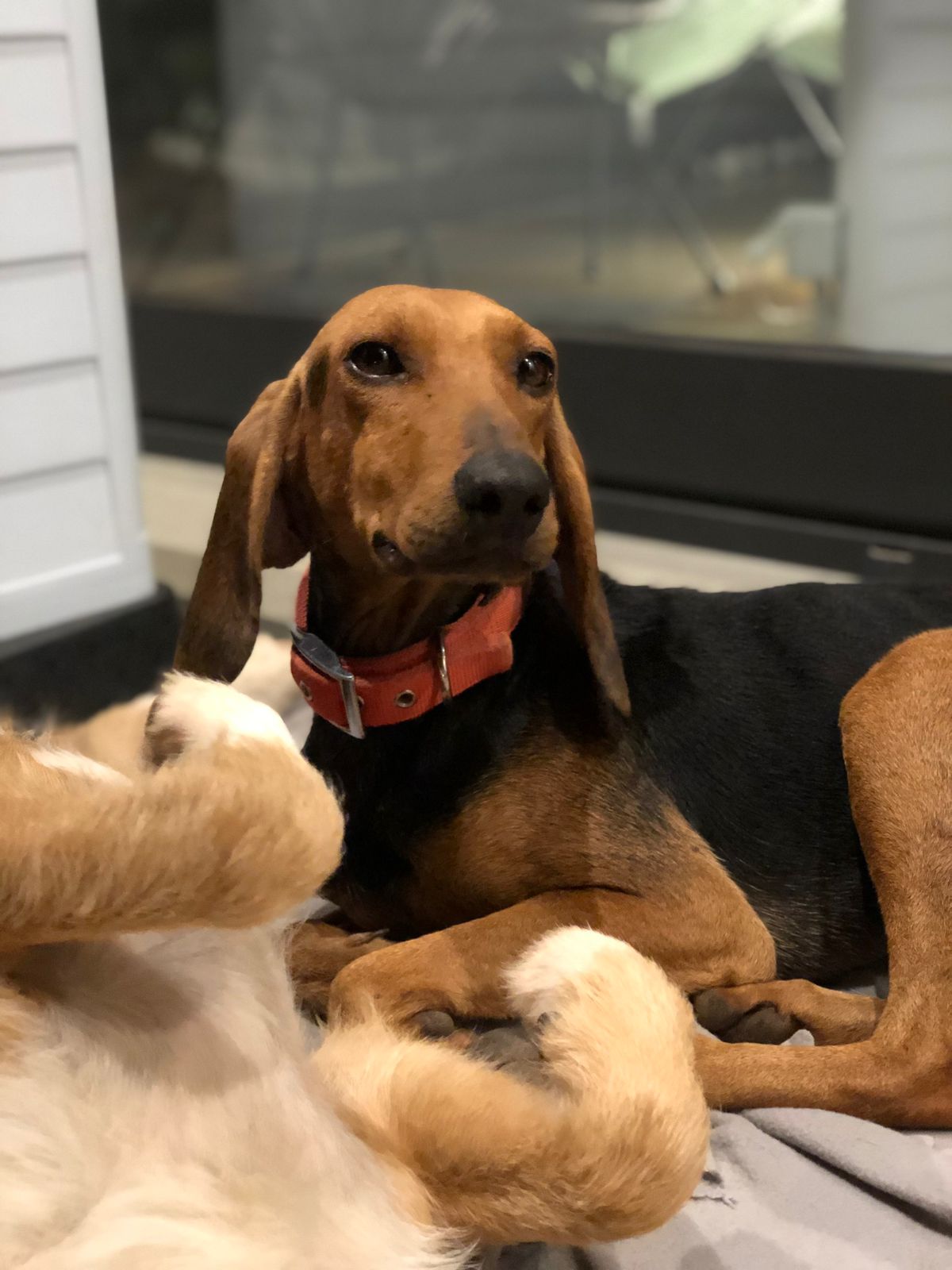 Κυνηγόσκυλο χρώματος καφέ μαύρο, στειρωμένος, αδύνατος, τσιπαρισμένος.