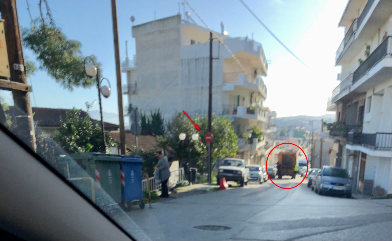 Βλέπουμε απορριμματοφόρο του Δήμου Λοκρών να είναι ανάποδα σε μονόδρομο.