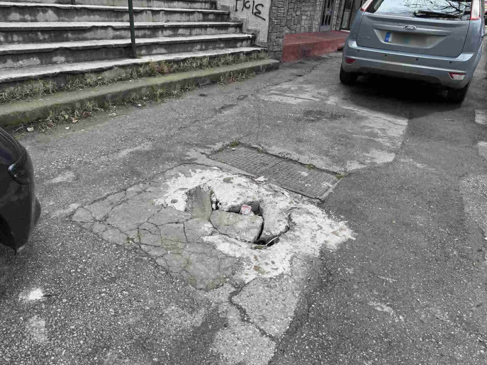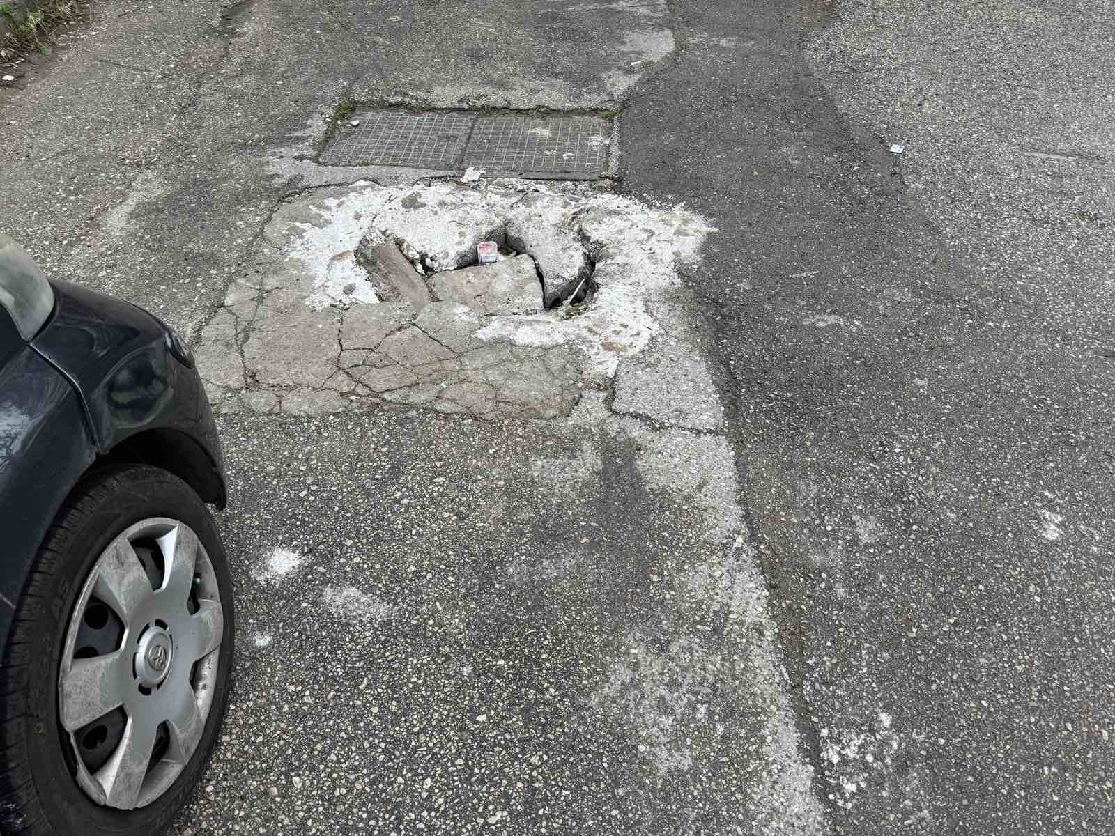 Όπως φαίνεται και στη φωτογραφία, το οδόστρωμα έχει υποχωρήσει, με αποτέλεσμα να υπάρχει ανοιχτό σημείο που μπορεί να προκαλέσει ζημιές σε οχήματα ή ακόμη και τραυματισμό, ειδικά τις βραδινές ώρες ή σε συνθήκες μειωμένης ορατότητας.