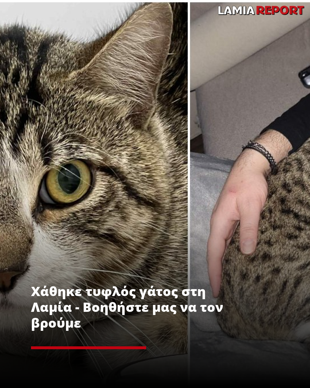 Χάθηκε την Κυριακή 01-03-2026 τυφλός γάτος χρώματος γκρι και λευκό στη Λαμία, στην οδό Λεωσθένους κοντά στη συμβολή με την οδό Φειδίου.